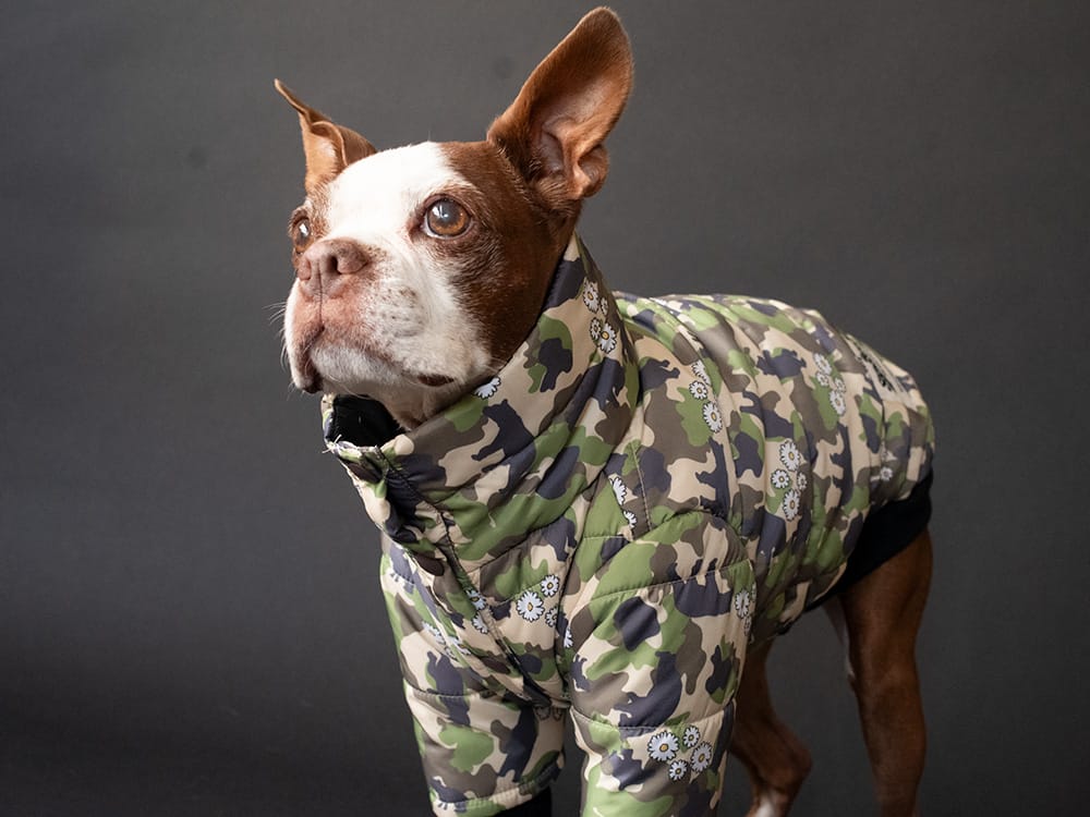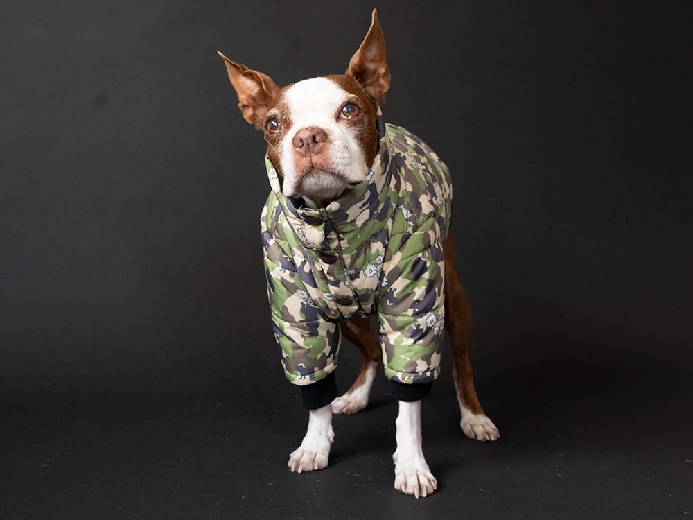 ※モデル犬(フレブル)は小さい体格のためレギュラーサイズを着用しています。実際のFBサイズは首丈は短めにお作りしています。